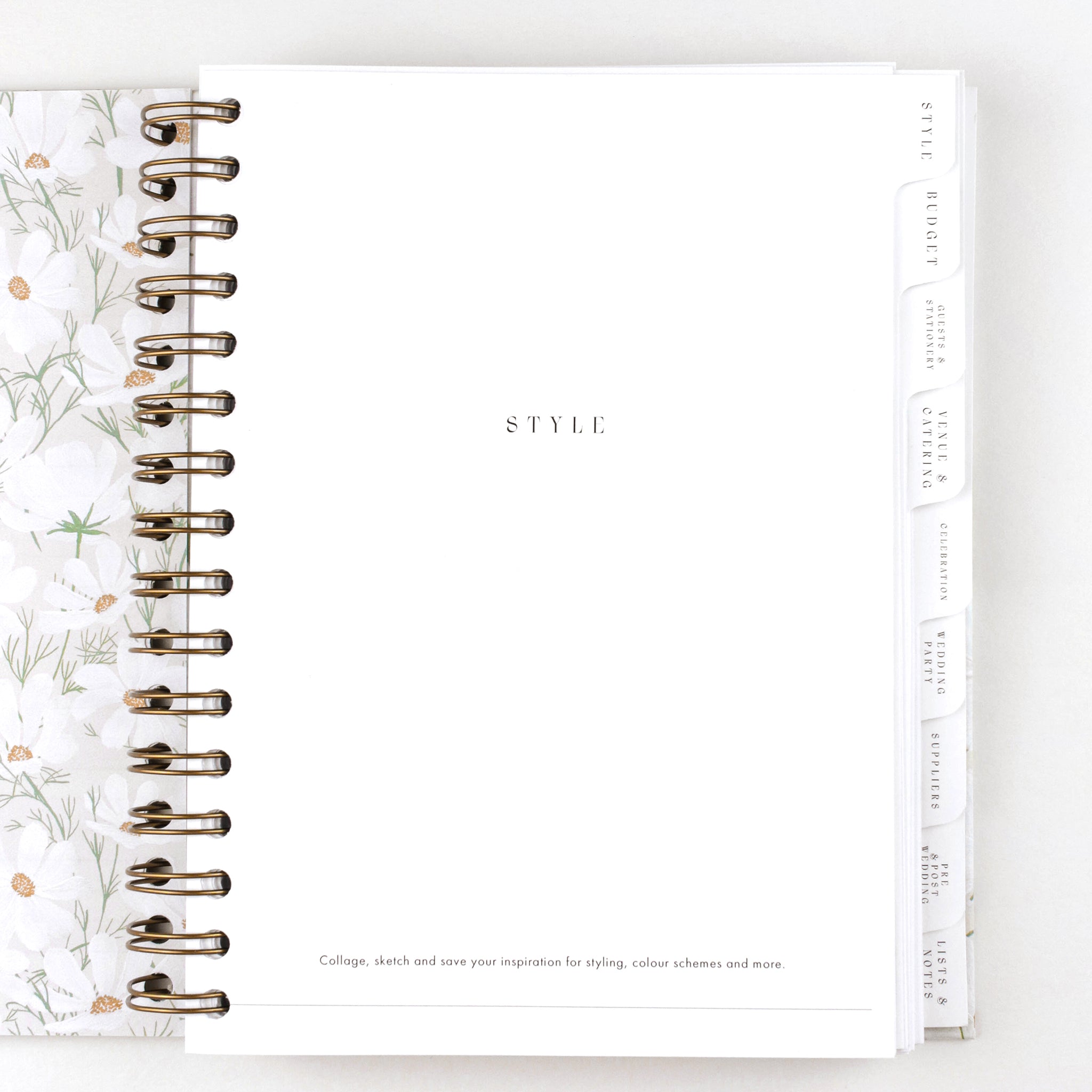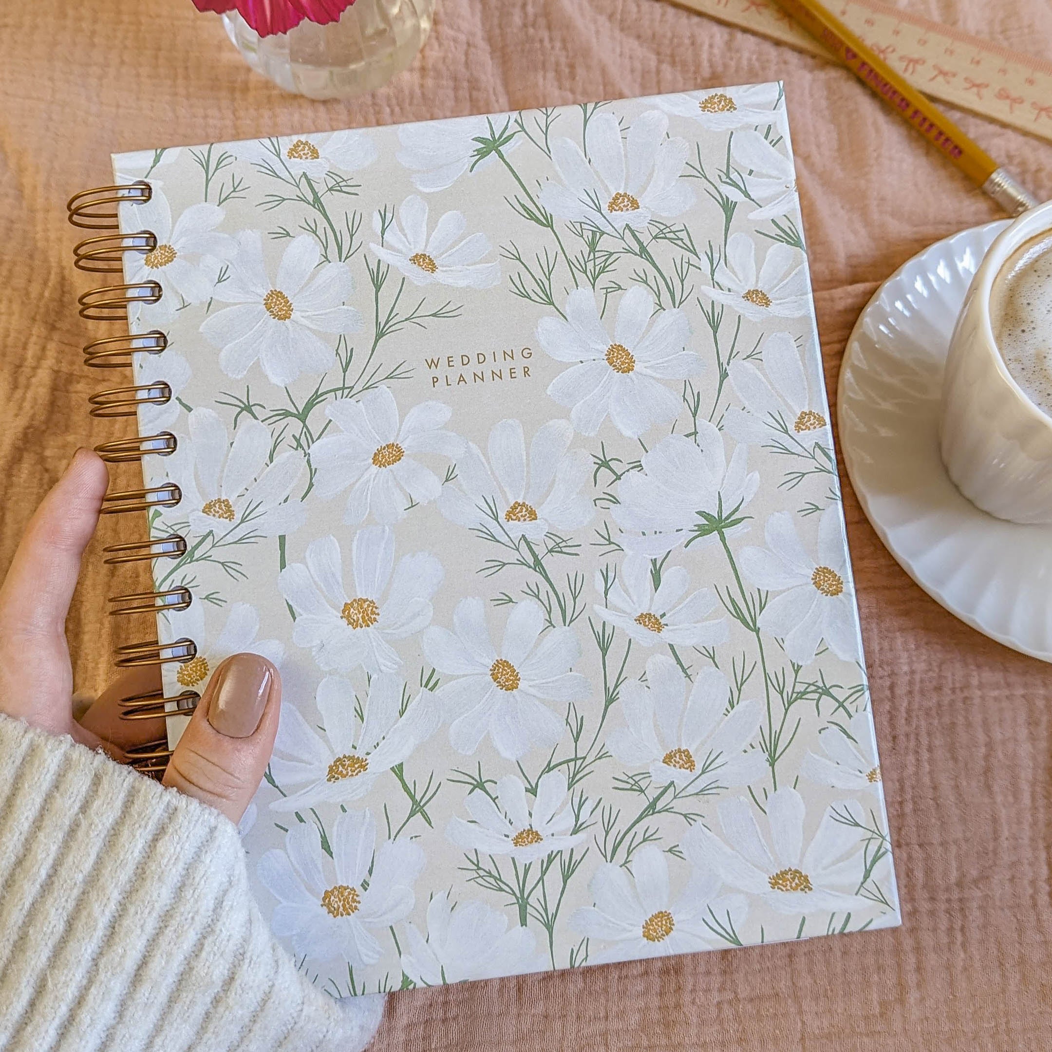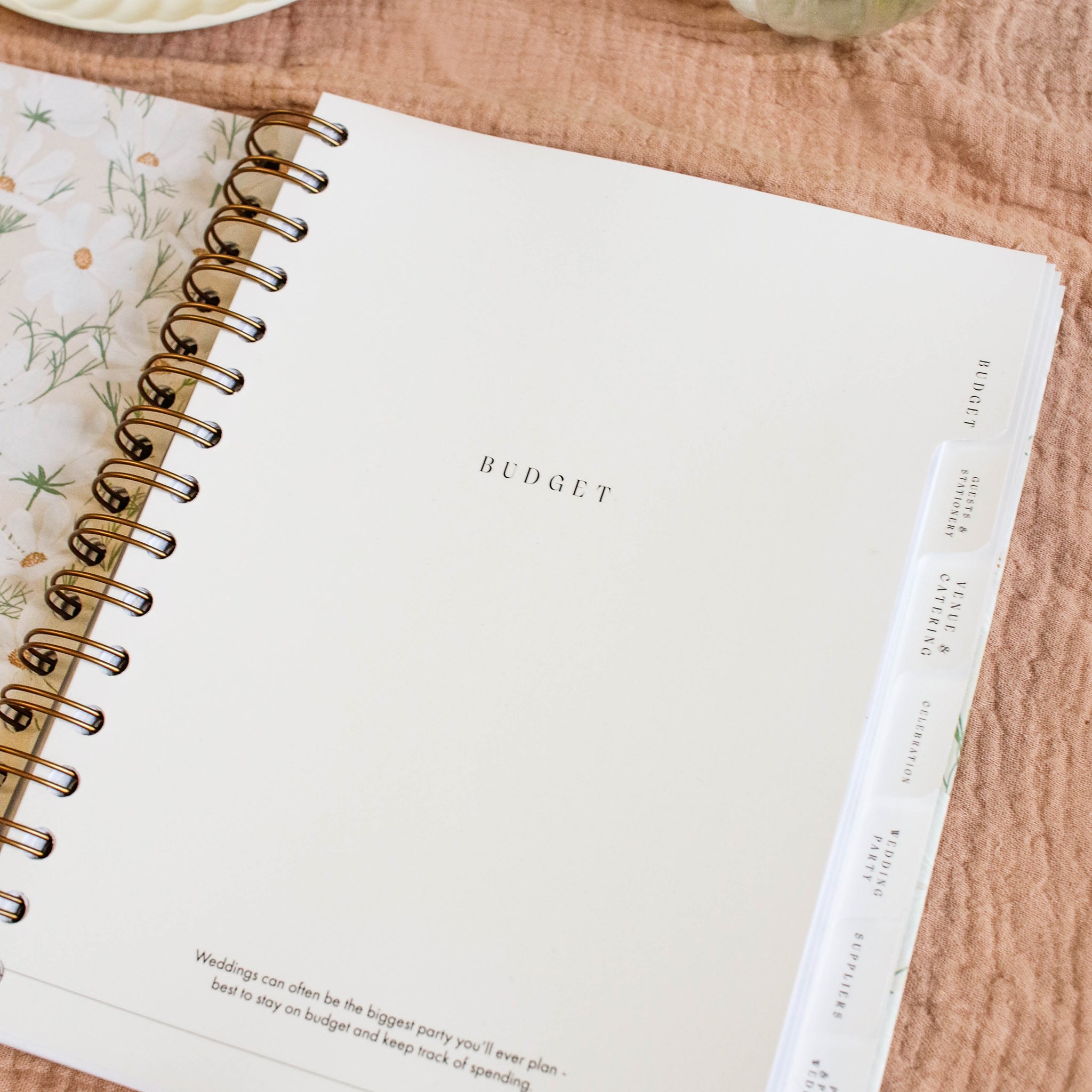 A beautiful ring-bound floral-covered wedding planner book, designed to be inclusive and customisable