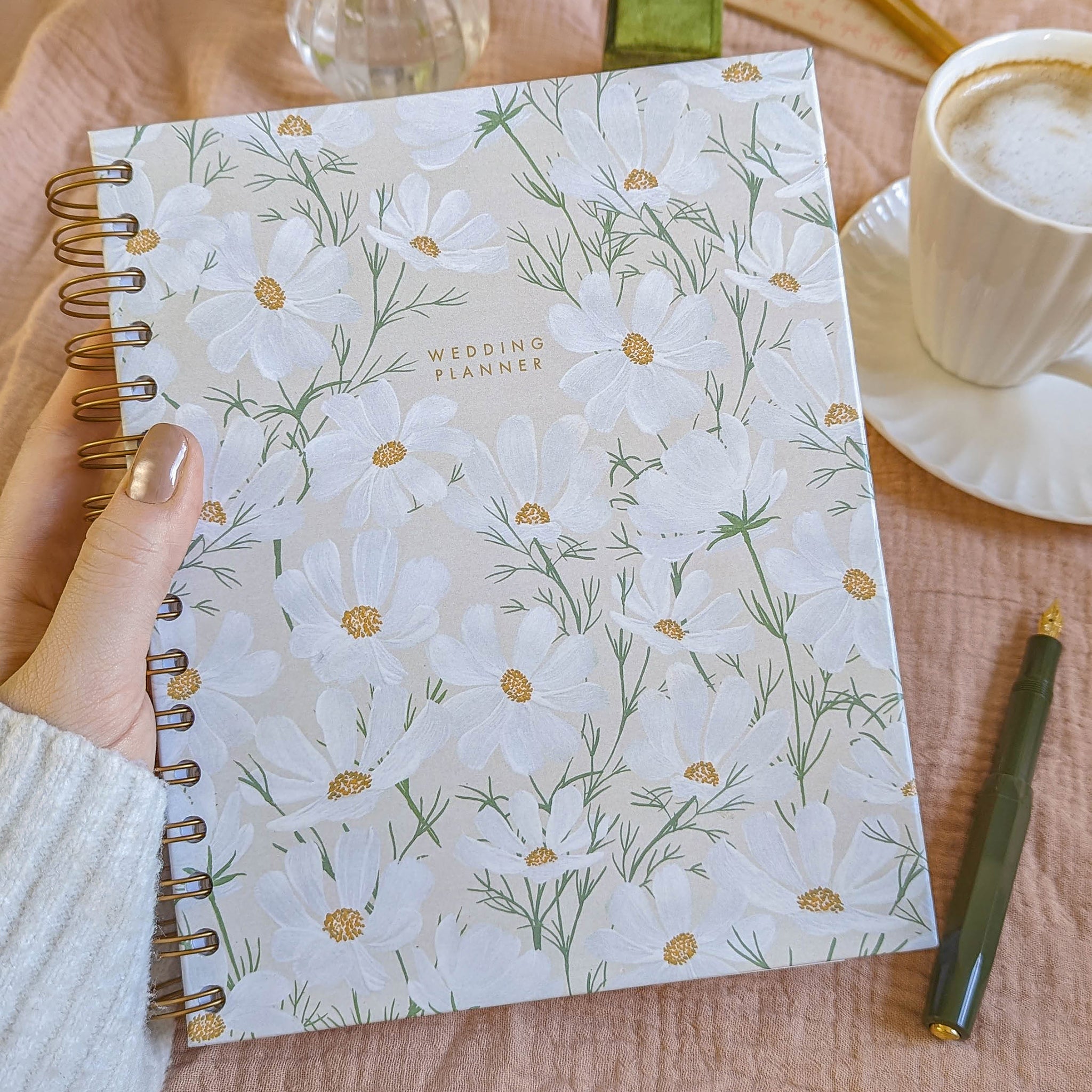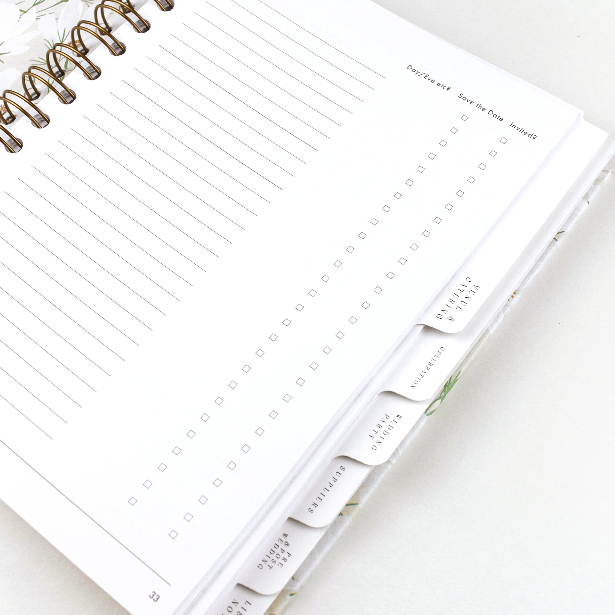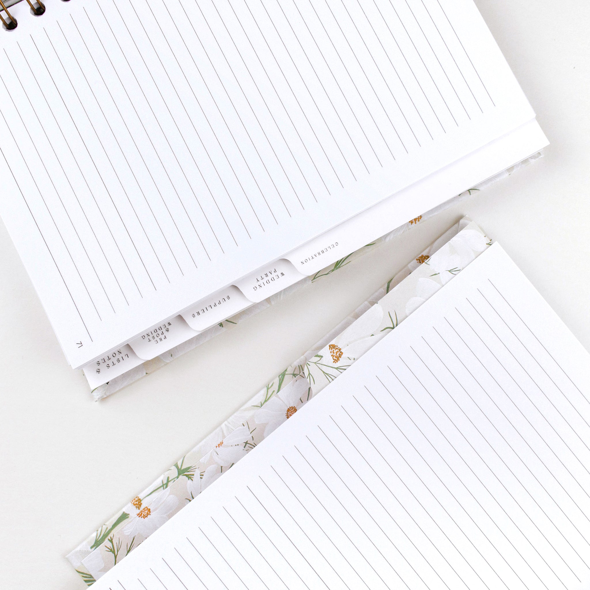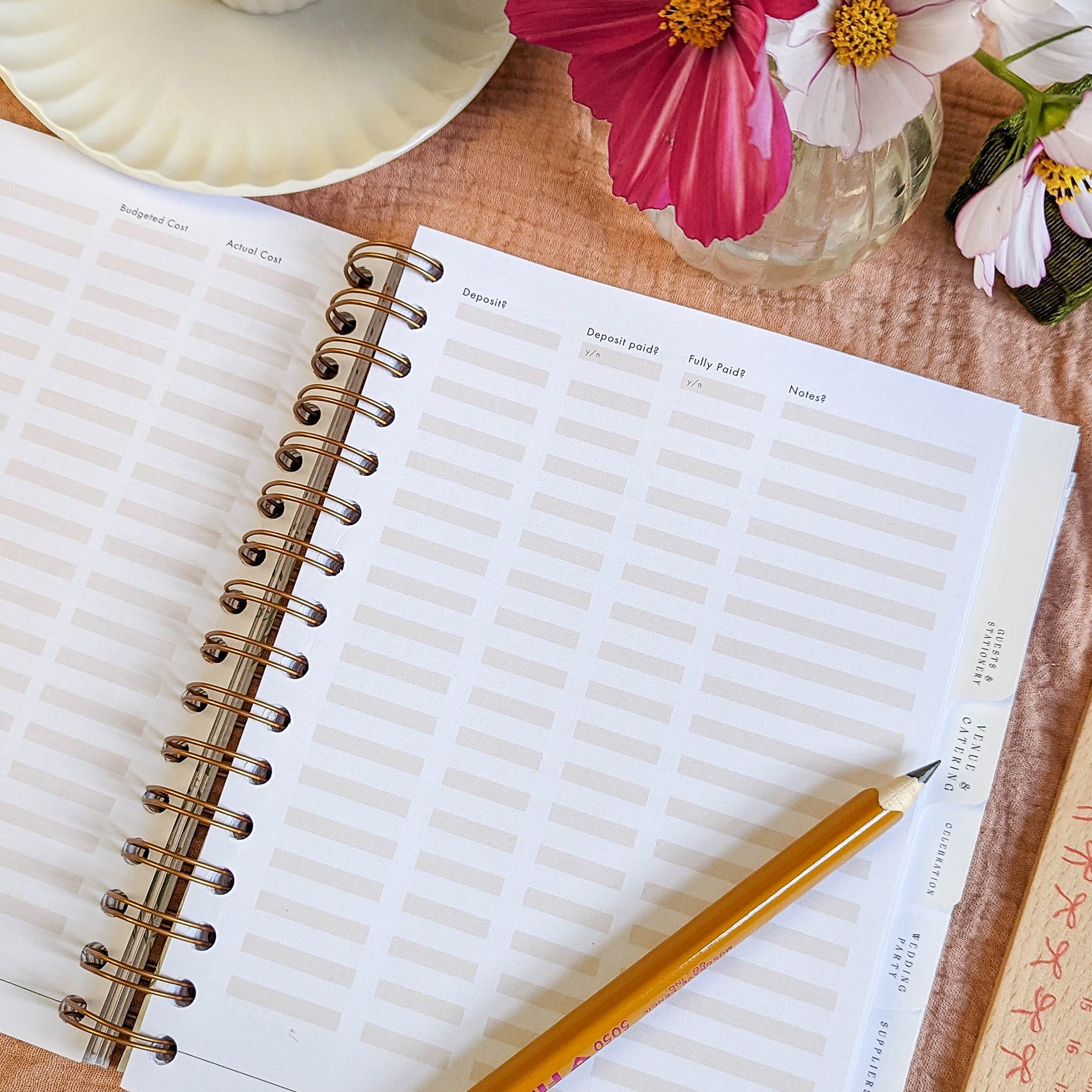 A beautiful ring-bound floral-covered wedding planner book, designed to be inclusive and customisable