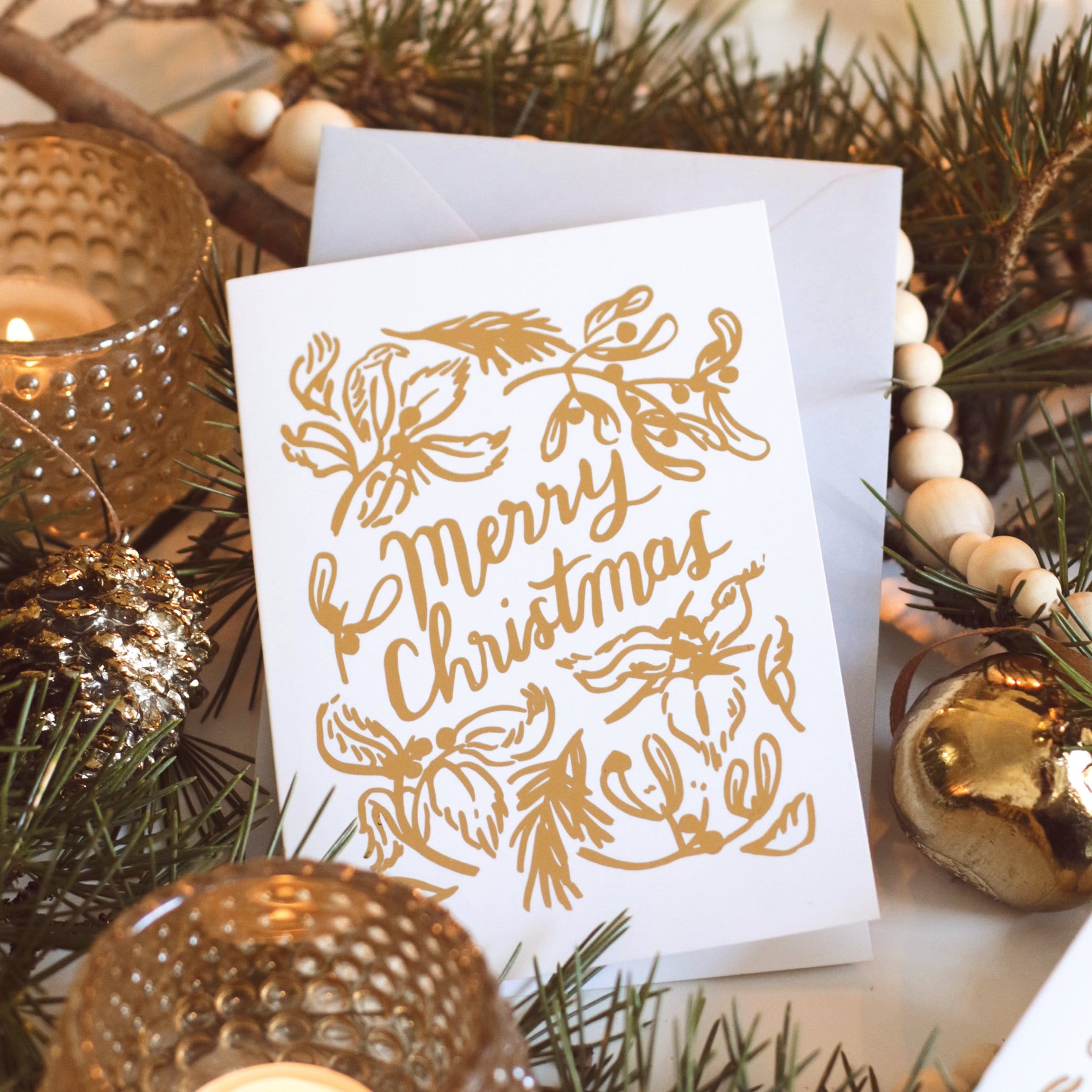 A beautiful, minimal Christmas card with simple but stunning gold foiled illustrations of Mistletoe, Holly and Fir. Lettering reads “Merry Christmas”.