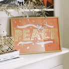 Created from Annie’s original hand drawn type and illustrations, and finished with lashing of festive gold foil. Lettering reads “PEACE” in luscious gold foil, decorated with tiny vintage scandinavian folk-inspired illustrations.