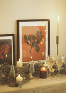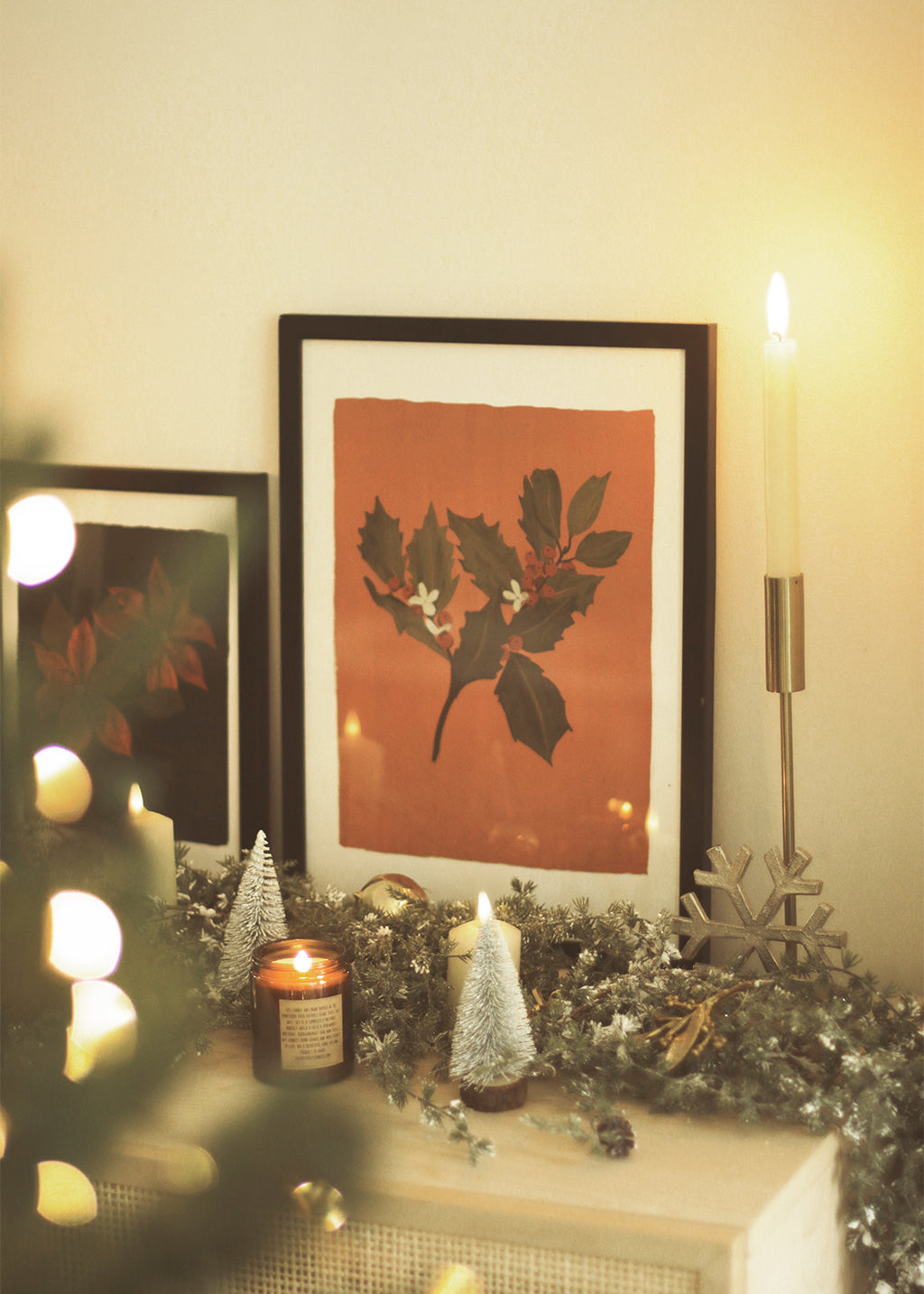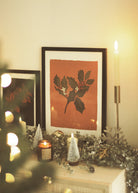 Featuring a sprig of holly with red berries and tiny white flowers, on a warm red painted background.