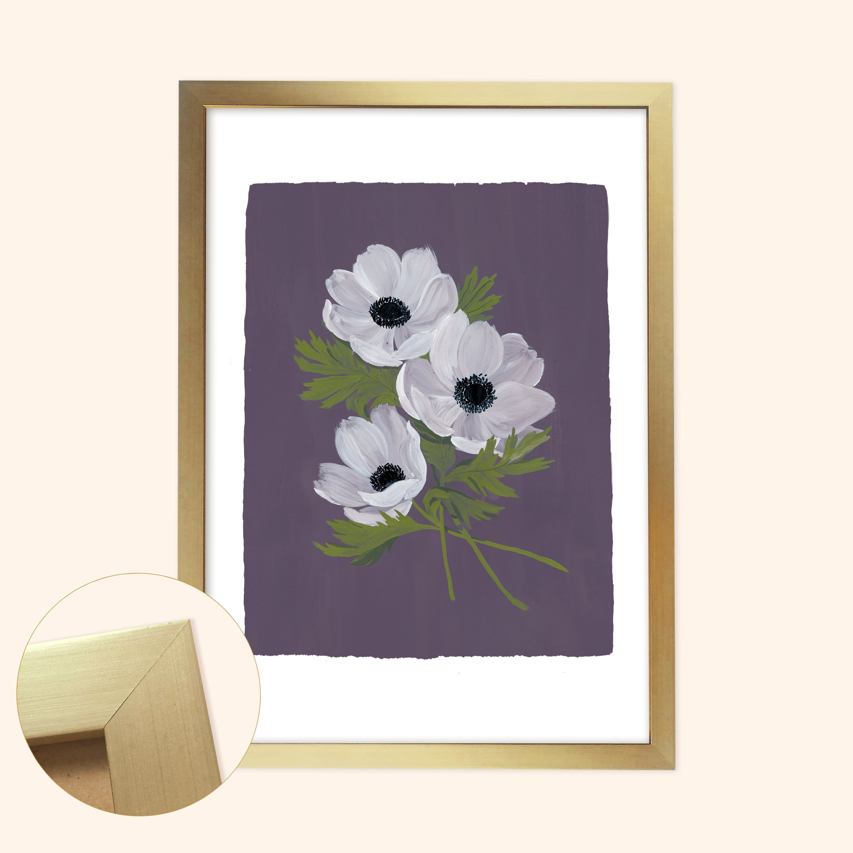 Featuring three stems of delicate white Anemone flowers, against a rich, violet-hued background.