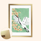 In Japan, the Crane is a symbol of happiness and long life, and Cherry Blossoms signify the arrival of spring. Feauturing an elegant Japanese crane in flight, painted against a backdrop of Sakura (Cherry Blossom) flowers and a teal sky