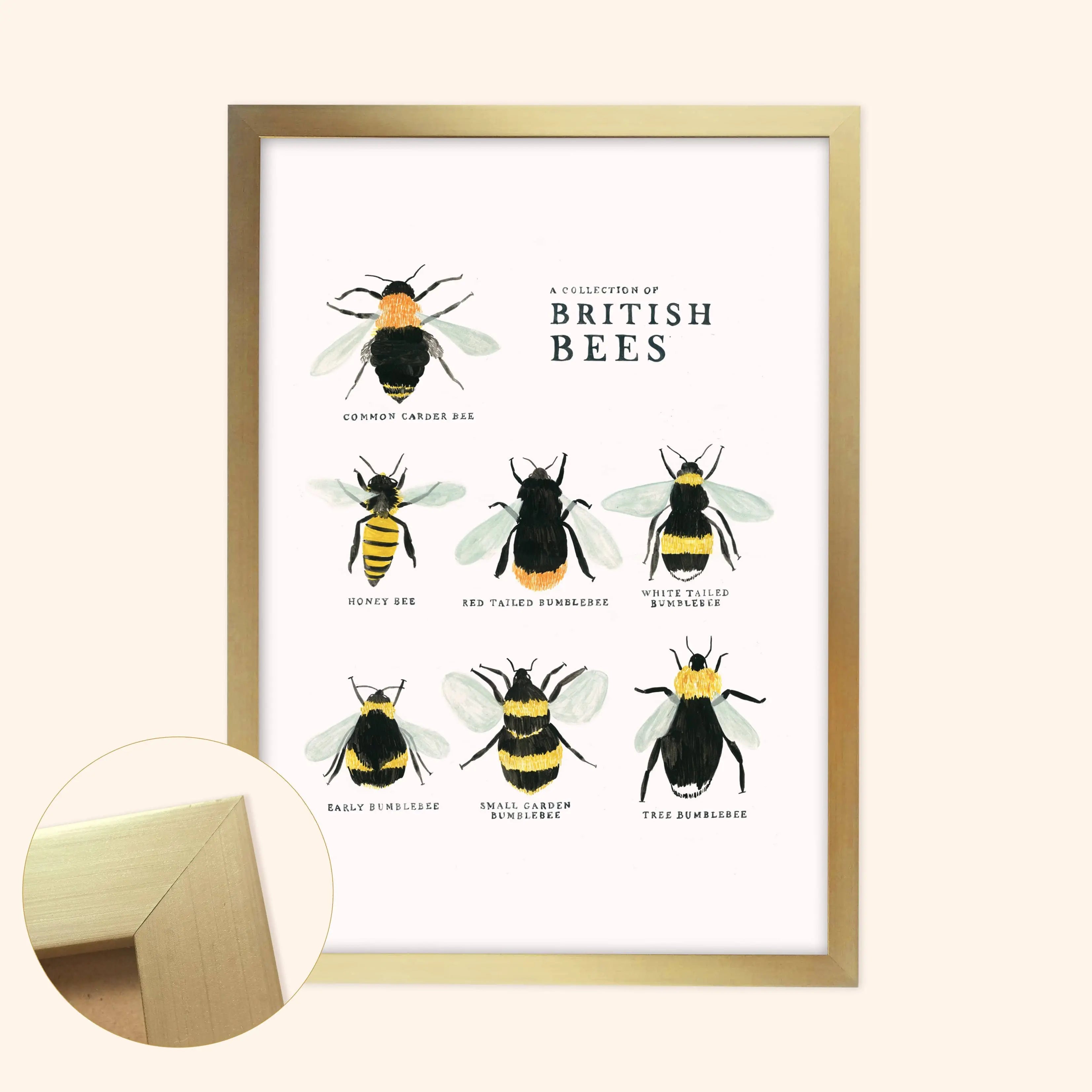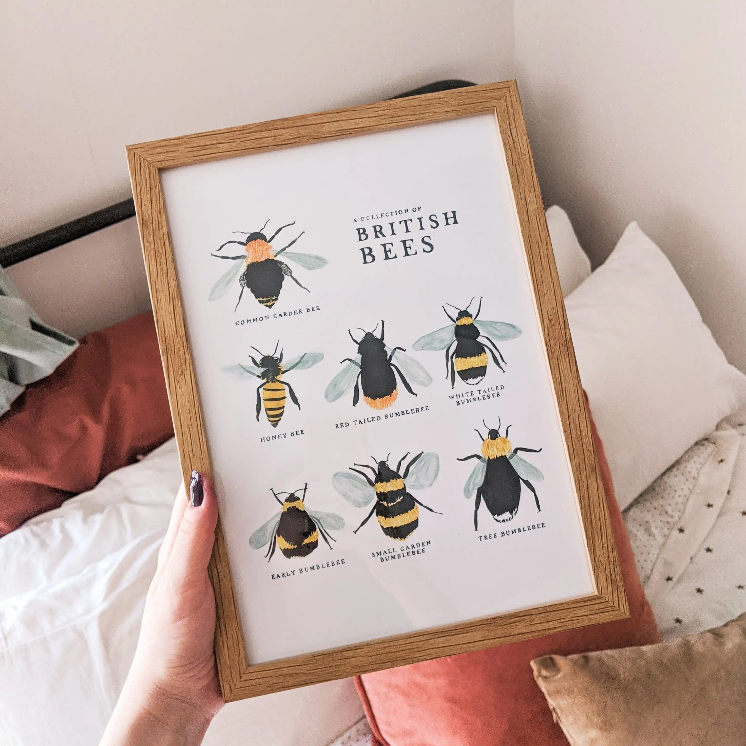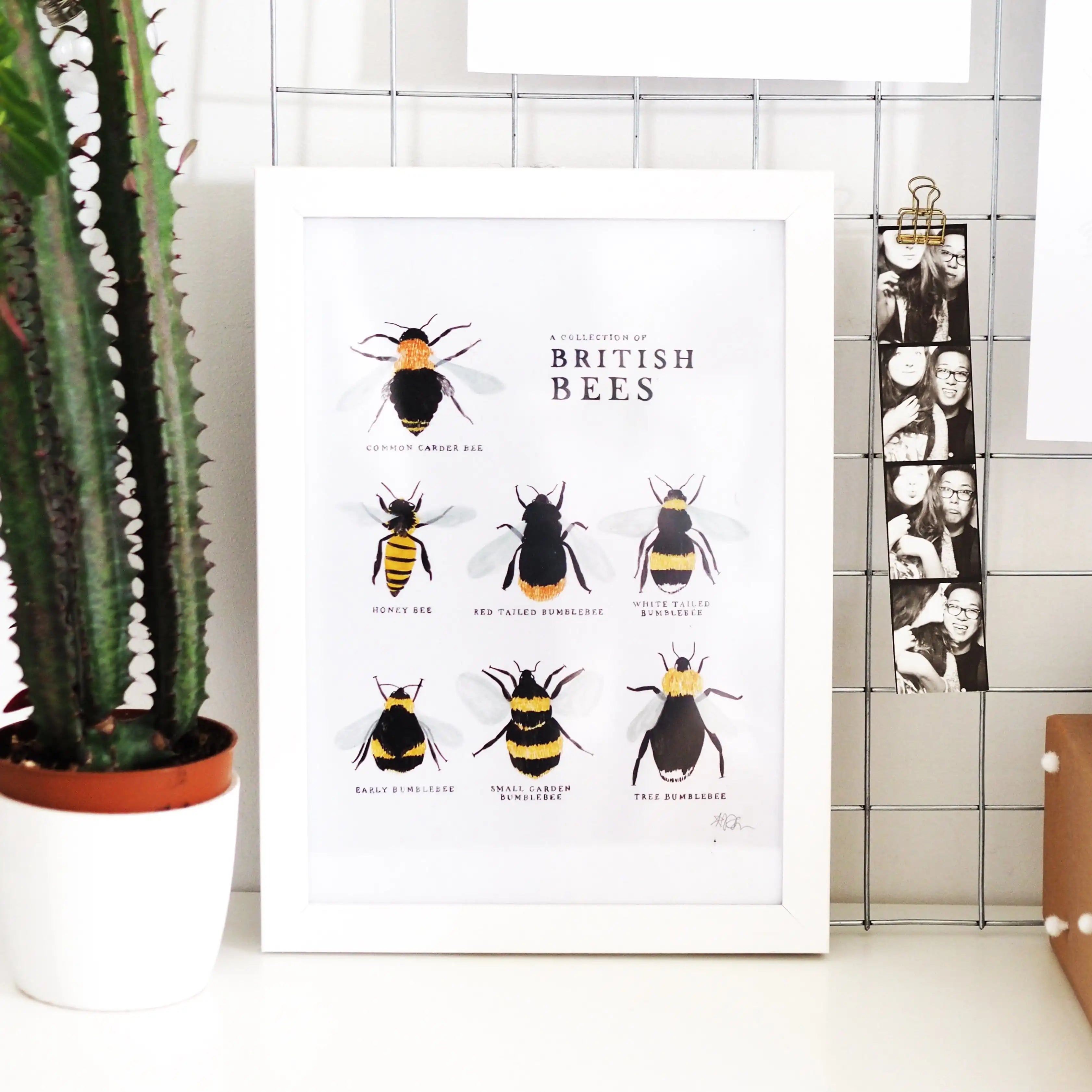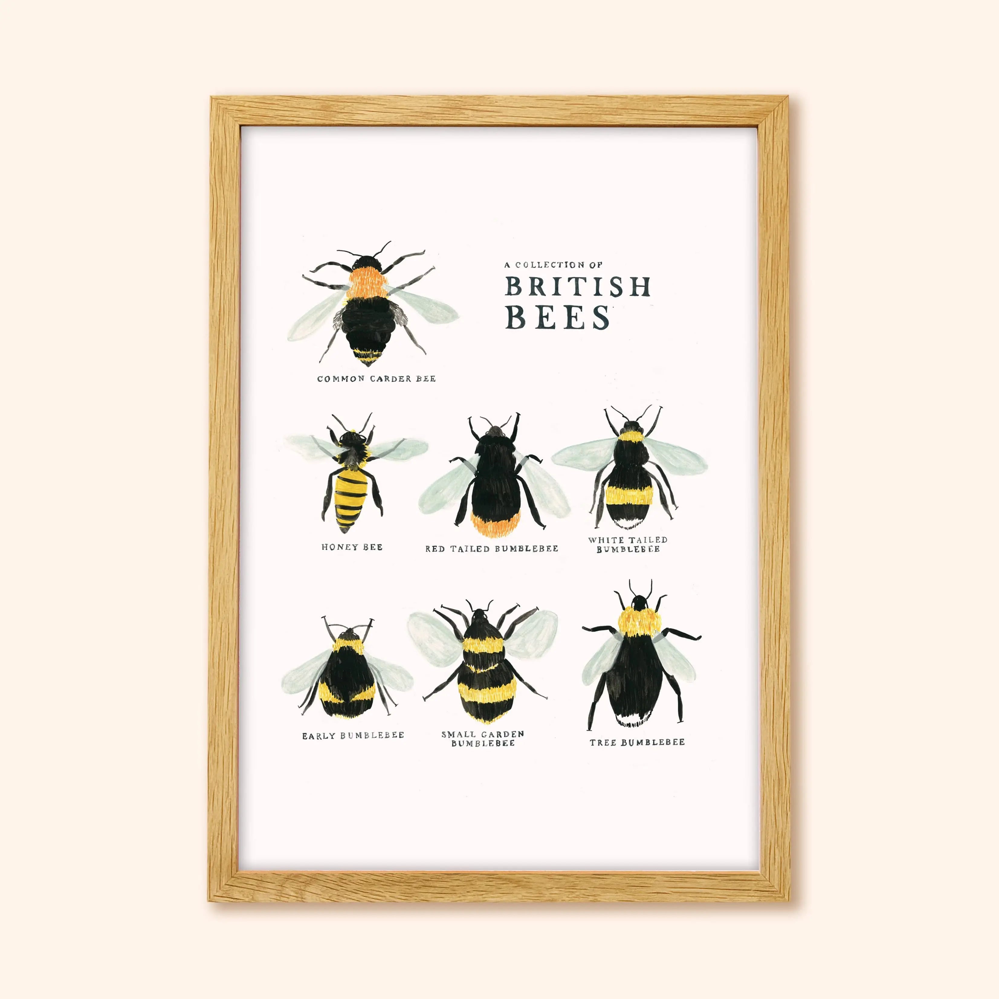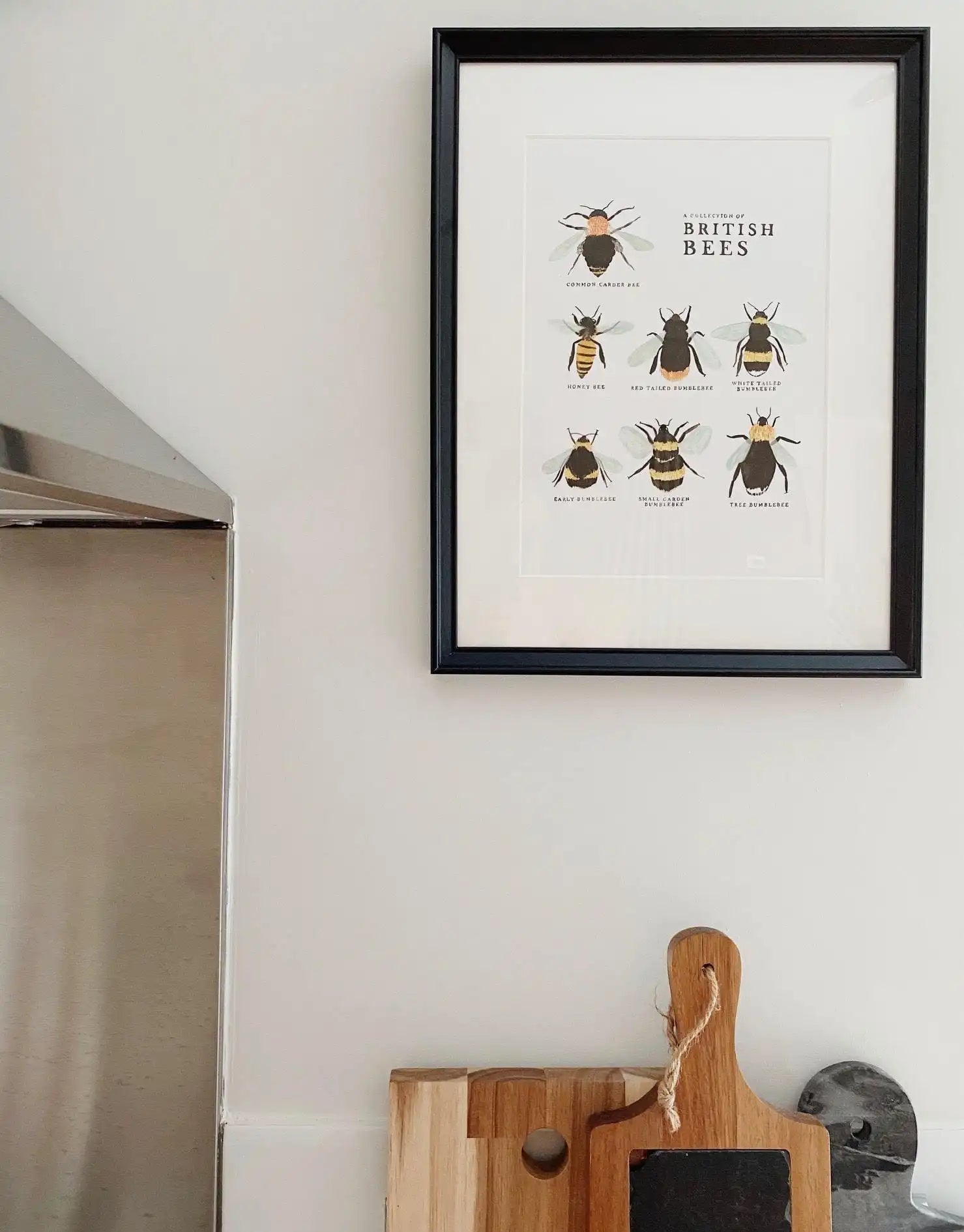 A delightful bee identification style chart printed on a lovely, thick paper stock with a slightly textured surface. This lovely bee wall art is the perfect gift for bee lovers and features a collection of Britain’s most common bumblebees and honey bees. Available in two sizes - A3 and A4, choose the size that makes the best living room wall art or kitchen print!