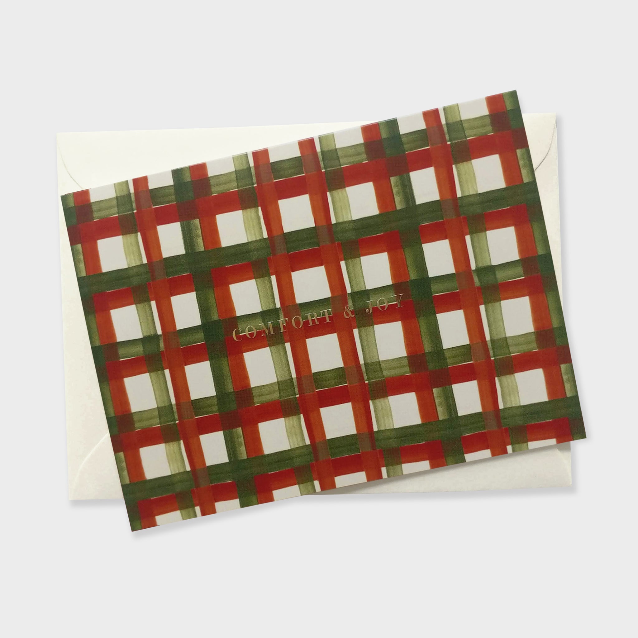 Inspired by a return to cosy, Christmas traditions, this design features a hand painted tartan-style design created with Gouache paint, and transformed into this festive Christmas card. Each card is made in the UK using sustainably sourced card from an FSC Certified manufacturer, and is finished with gold foil lettering that reads “comfort and joy”.
